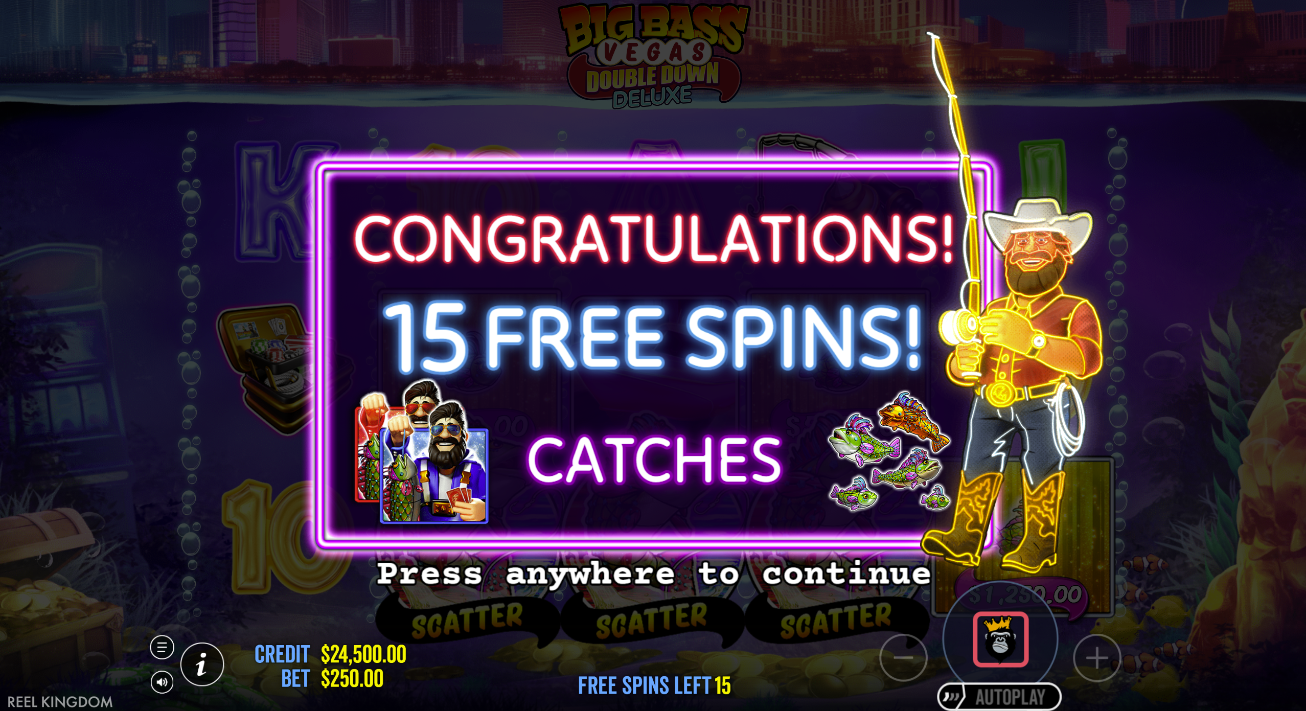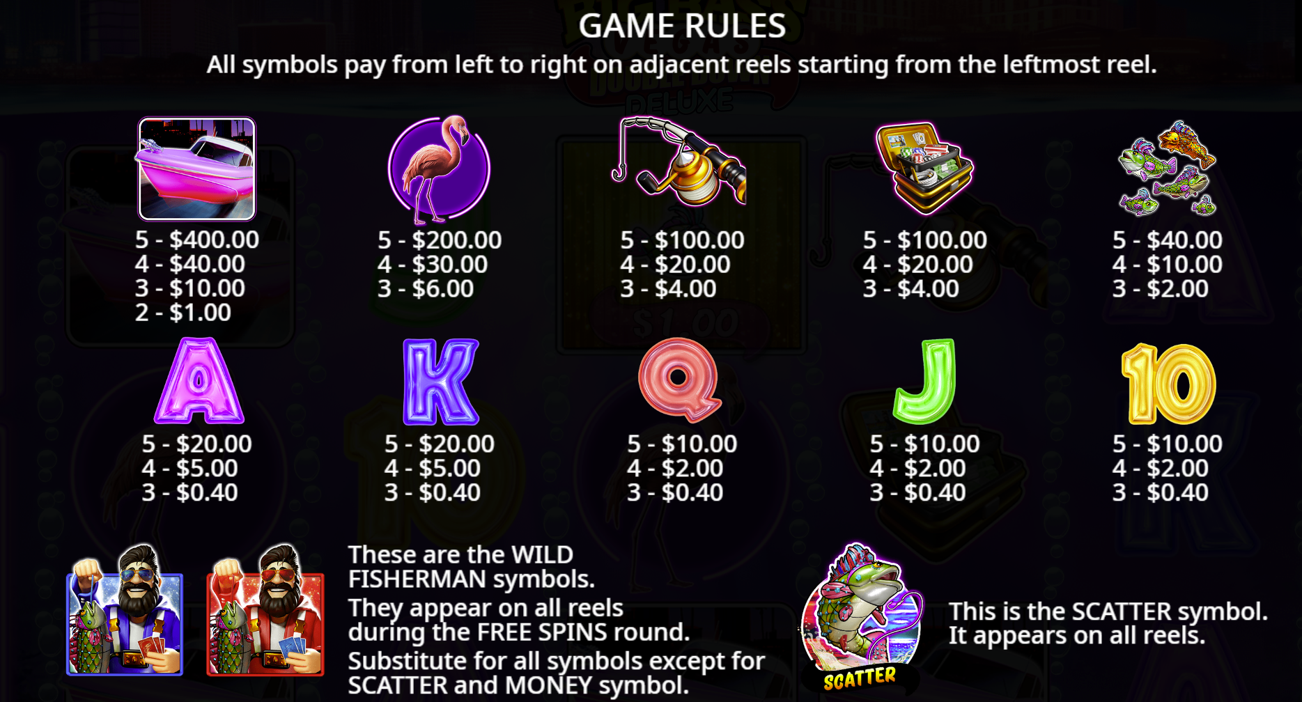 • Sticky Fisherman: Fisherman Wild stays on reel 5 throughout free spins for auto collections.