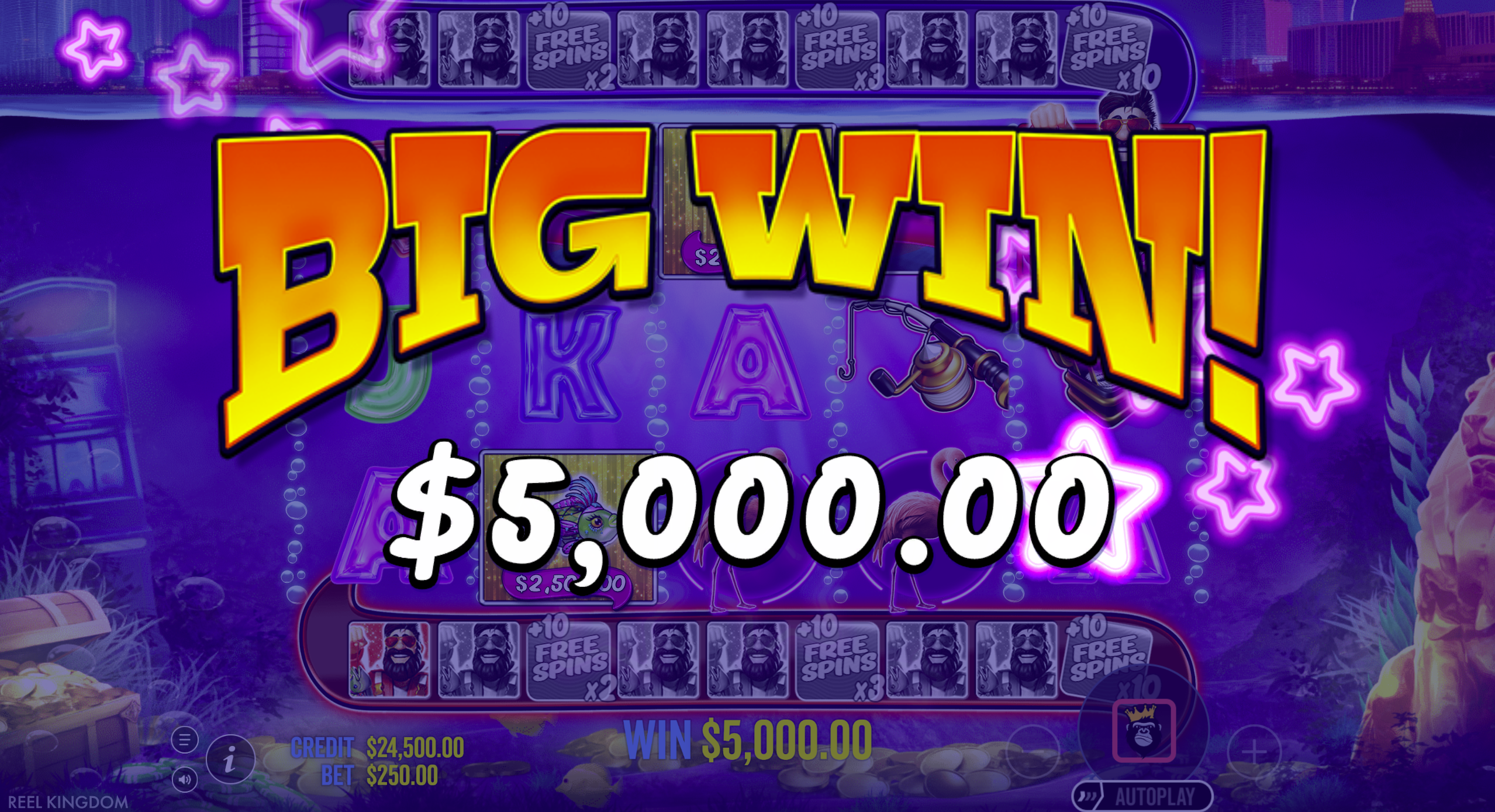 Free spins get a major boost with random starting multipliers. Starting bonus rounds with 5x or 10x multipliers greatly increases winning potential from the first spin. Combined with sticky Fisherman Wild and retriggers, this creates the most powerful bonus potential in the series.